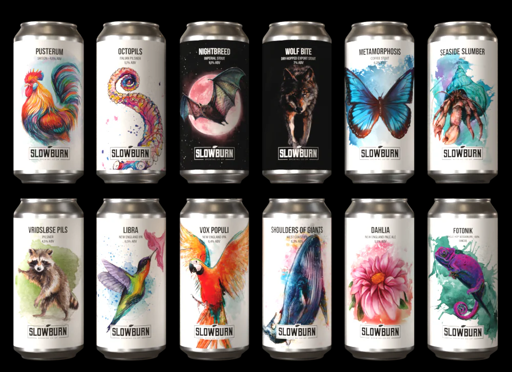 Watercolor label illustrations for the cooperative brewery Slowburn.
